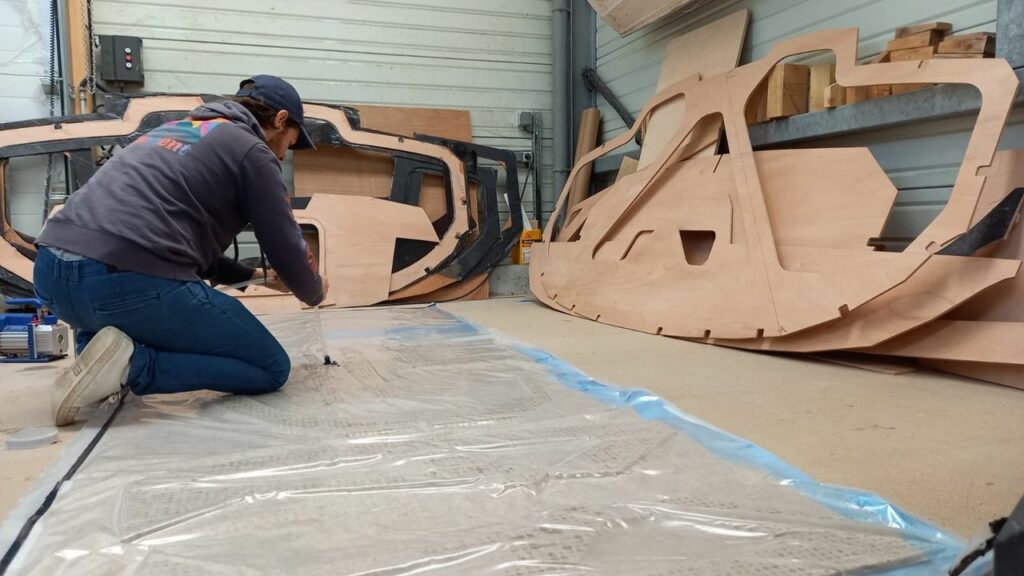 Construction d’un 6,50 m en composite de contreplaqué au chantier Kaori Concept. On aperçoit les cloisons prêtes au montage sur le côté droit et au fond de l’image.